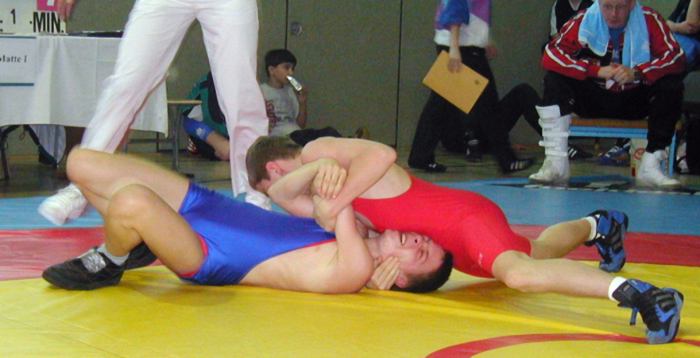 Als zweiter Doppelsachsenmeister nach dem Lugauer Michael Gruner durfte sich David Ludwigkeit vom RV Thalheim feiern lassen. Lange musste der 31-kg-Mattenfloh auf seinen Finalkampf warten, doch als es los ging, war er gegen Walter Jürgens vom AC Werdau voll konzentriert. Der blonde Thalheimer zog schon nach wenigen Sekunden zielstrebig seinen Kopfhüftschwung und beförderte damit den Westsachsen in die gefährliche Lage. Noch anderthalb Minuten dauerte es dann allerdings, bis Jürgens endgültig auf den Schultern lag und David den Landesmeistertitel in der Tasche hatte, womit er den Viererpack an Meistern für die Landkreisringer komplettierte.