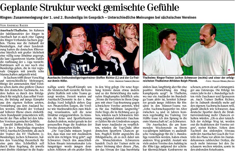 | Geplante Struktur weckt gemischte Gefühle Zusammenlegung der 1. und 2. Bundesliga im Gespräch - Unterschiedliche Meinungen bei sächsischen Vereinen Von Andreas Bauer Auerbach/Thalheim. Im Rahmen der Jubiläumsfeier der Ringer in Auerbach hat es auch eine Tagung des Ringer-Verbandes Sachsen gegeben. Thema war die Zukunft der Bundesligen. Auf einer Sondersitzung hatten die deutschen Elitevereine kürzlich mit großer Mehrheit eine völlig neue Struktur angeregt, die laut Ligareferent Martin Daßler die Auflösung der 2. Liga vorsieht. Stattdessen soll es nur noch eine Bundesliga geben, die in vier regionale Gruppen mit jeweils zehn Mannschaften aufgeteilt wird. In Sachsen trifft dieser Vorschlag auf unterschiedliche Meinungen. Einige der anwesenden fünf Vereine sehen darin eine größere Chance für den deutschen Nachwuchs. Andere halten es durch den Erfolgsdruck für möglich, dass selbst Vereine, die bislang auf junge Kämpfer aus den eigenen Reihen setzten, Verstärkung aus dem Ausland holen werden. Obwohl der Verband auf höherer Ebene einen einheitlichen Standpunkt präsentieren will, weckt der Plan selbst bei den lokalen Vereinen gemischte Gefühle. Zustimmung von Richter und Schwarzer Sowohl Steffen Richter, Trainer der in der 1. Bundesliga ringenden WKG Auerbach/Chemnitz, als auch der Trainer des RV Thalheim (2. Bundesliga), Jochen Schwarzer, halten den Vorschlag theoretisch für eine gute Idee. Schließlich soll durch diese Regelung, die jeweils zwei direkte Absteiger in die Regionalliga sowie Play-Off-Kämpfe um die Meisterschaft vorsieht, für komplette Staffeln mit zehn Teams gesorgt werden. Derzeit warten auf Auerbach/Chemnitz in der 1. Bundesliga Nord lediglich sieben Gegner. Finanziellen Sorgen, die Vereine wie Markneukirchen zum Rückzug veranlassten, soll die neue Struktur entgegenwirken. So könnten die Reise- und Sportlerkosten dadurch sinken, wobei gerade in der personellen Frage die Reaktion der Vereine abzuwarten bleibt. Hoffnung auf positive Leistungsentwicklung "Die Top-Clubs müssen begreifen, dass man nur mit Ausländern nicht den richtigen Weg geht", sagt Schwarzer. Durch den ausschließlichen Einsatz internationaler Leistungsträger werde jungen deutschen Athleten oft ein großer Stein in den Weg gelegt. Die neue Regelung könnte daran etwas ändern und so der Entwicklung des nationalen Ringkampfes behilflich sein: "Wenn die Favoriten in ihren Gruppen mit einer Top-Besetzung gegen schwächere Vereine antreten, wird es für das Publikum langweilig." Hohe Siege, die in Richtung 40:0 gehen, würden nach Schwarzers Meinung aufgrund sinkender Zuschauer-Zahlen für ein Umdenken sorgen. Statt teure Ausländer zu verpflichten, würden die Top-Clubs öfter deutschen Sportlern Chancen geben. Thalheim: Langfristig Nachwuchs in erste Mannschaft Fraglich bleibt angesichts des Erfolgsdrucks, ob es sich dabei um ein Wunschdenken Schwarzers handelt. Doch der Trainer steht zu seiner Meinung über diesen "Plan, der das Niveau der Liga kurzfristig sinken lässt, langfristig aber für eine positive Entwicklung des Ringkampfsports sorgt". In Thalheim, wo nur ein Ausländer im Bundesliga-Team aktiv ist, bereitet Schwarzer gerade junge Athleten für Einsätze in den Männer-Teams vor. "Zehn Nachwuchssportler im Alter zwischen 14 und 16 Jahren kommen regelmäßig ins Training. Der Hälfte traue ich den Sprung in die erste Mannschaft zu", so Schwarzer. Auerbach: Setzen auf Leistungsträger aus dem Osten Die Auerbacher, die am letzten Wochenende zu ihrem 100-jährigen Jubiläum einige ihrer 13 ausländischen Neuzugänge für die 1. Bundesliga vorstellten, haben einen anderen Weg gewählt. Anstatt wie viele andere Vereine den Aufstieg in die Elite-Liga aufgrund der scheinbar übermächtigen Konkurrenz zu scheuen, setzen sie auf Leistungsträger aus Osteuropa. Die Erfolge im ersten Jahr in der 1. Bundesliga lockten viele Zuschauer und Sponsoren an. Auch Trainer Steffen Richter, der in Zukunft ebenfalls mehr auf den eigenen Nachwuchs bauen will, glaubt ähnlich wie Schwarzer, dass deutsche Sportler durch die Strukturveränderung mehr Chancen erhalten würden. "Ob es aber tatsächlich der richtige Weg ist, werden erst die Reaktionen der Vereine zeigen", meint Richter. Neben dem Nachteil des sinkenden Niveaus sieht der Auerbacher Coach die Vorteile des Plans vor allem im Zustandekommen zahlreicher Derbys, die noch mehr Interesse bei den Zuschauern wecken würden, sowie in den sinkenden Reisekosten. aus: Freie Presse Stollberg, 16.6.2005 - Original-Artikel (mit Bildern) |