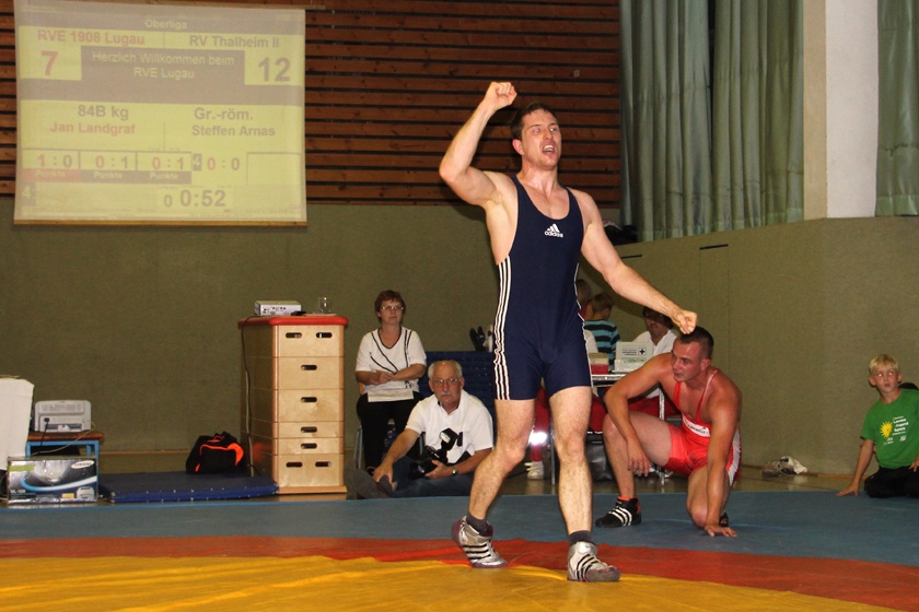 Sven Zimmermann (74 kg, Freistil), Trainer der Gäste, hatte es gegen einen starken Marcus Nürnberger nicht leicht, behielt jedoch mit 3:1 die Oberhand und meinte nach dem Kampf: "Für die Zuschauer waren es wirklich sehr interessante Duelle. Wir haben dank einer geschlossenen Mannschafts-Leistung beide Punkte entführen können. Toll vor allem der Auftritt unserer jungen Talente, da muss man den Hut ziehen." Damit gewinnt die zweite Vertretung aus Thalheim zum fünften Mal hintereinander das Lokal-Derby gegen die Eichenkränze aus Lugau. In den Vorkämpfen gab es sagenhafte 22 Freundschafts-Duelle zwischen Sportlern aus Lugau und Thalheim. Wegen des Rückzuges von Germania Artern aus der Jugendliga Mitteldeutschland war der frühe Samstagabend wie geschaffen für einen Leistungs-Test der sonst zusammen auftretenden Wettkampf-Gemeinschaft der Nachbar-Vereine. Gewertet wurden acht Duelle nach Festlegung des gastgebenden Trainers Michael Radtke, wobei hier die Lugauer die Nase vorn hatten. „Wir haben sehr schöne Kämpfe gesehen, die durchaus auch aufschlussreich für die Auswahl der Athleten bei der Jugendliga gewesen sind. Es war sehr zufriedenstellend“, resümierte RVT-Jugendwart Tino Korb im Hinblick auf den nächste Woche in Thalheim anstehenden Meisterschafts-Kampf gegen Leipzig/Taucha. Wettkampfprotokoll: liga-db.de weitere Bilder (Klicken zum Vergrößern):